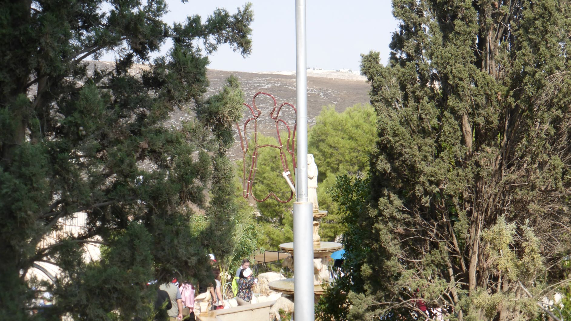 Fountain at the Shepherd's Fields with sheep and a shepherd.